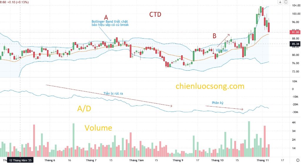 Tại thời điểm A, CTD liên tục ở phía trên MA20 và kỳ vọng cho một cú break sắp tới. Nhìn đường A/D ta thấy nó liên tục hướng xuống (mà nếu chỉ nhìn biểu đồ Volume sẽ khó nhận ra). CP đã có một cú break xuống ủng hộ cho chỉ báo A/D đang hướng xuống. Nếu cùng tình huống co hẹp này mà A/D hướng lên thì nó lại củng cố cho khả năng cp break lên.