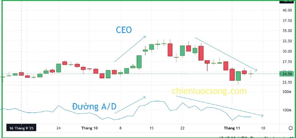 Vì MFV của CEO = 0 nên A/D của ngày hôm nay bằng A/D của ngày hôm qua; đường đi ngang.