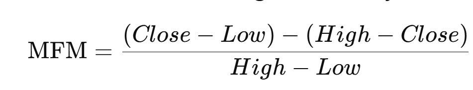 MFM là số dương khi giá đóng cửa nằm chính giữa tới giá cao nhất và là số âm khi nó nằm từ giá đóng cửa tới giá thấp nhất.