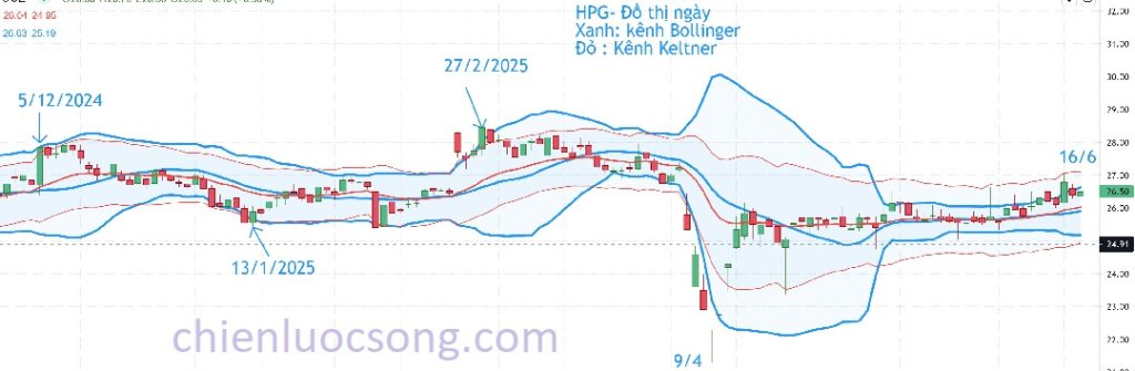 Đồ thị dưới là của HPG trong đó kênh nét xanh là Bollinger và kênh nét đỏ là Keltner. Kênh Keltner sát hơn mang lại nhiều thông tin hơn so với Bollinger.