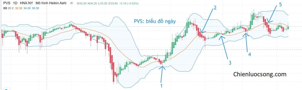 Chúng ta thấy cùng một nguồn thông tin nhưng khi hiển thị ở biểu đồ Heikin Ashi dễ nhìn hơn hẳn. Kết hợp với chỉ báo Bollinger Band ta thấy đường giá phản ứng rất rõ ràng khi đụng vào trung tâm của BB. Khi chạm vào ma20 của BB nó có xu hướng bật lên; nếu không bật lên thì nó sẽ đi về dải dưới rồi bật lên.
