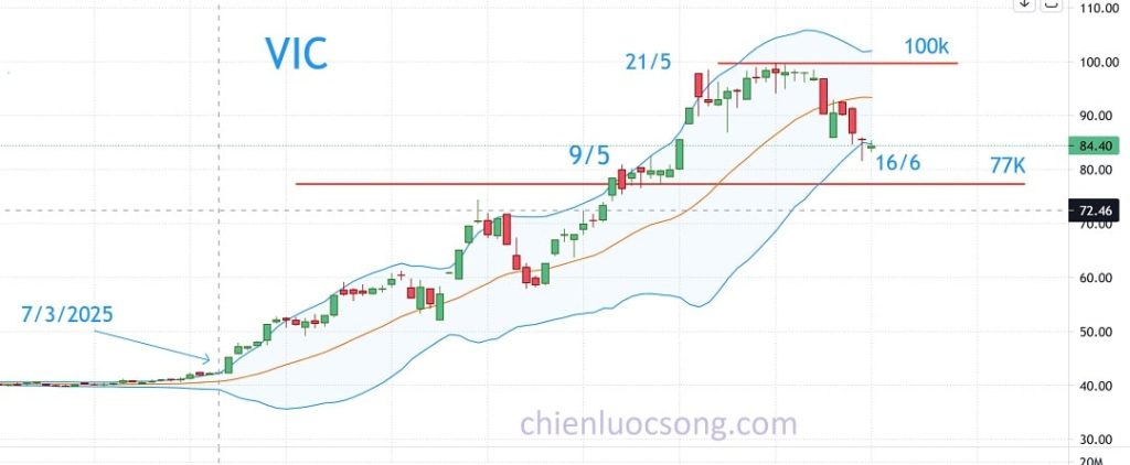 Phía dưới là đồ thị ngày của VIC nó liên tục tăng kéo dãn biên phía trên rất ít lần nó quay lại đường trung tâm vì vậy rất ít nđt dám mua