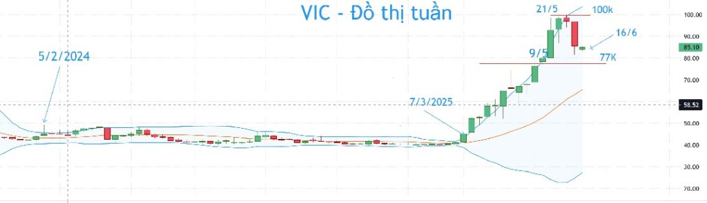 Nhìn trên đồ thị tuần thì càng thấy rõ; nó gần như không có tuần nào giảm điểm. Tuy nhiên hiện nó đã có 2 tuần giảm điểm khi gặp giá 100k. CP Vic tôi chỉ lấy ra làm ví dụ vì chẳng mấy nđt nhỏ lẻ nào nắm giữ VIC. Nó gần như đứng yên cả năm trời và nó được mệnh danh là cp lái thị trường nên khi nó tăng không mấy ai có cp này; lúc nó tăng thì không ai dám mua.