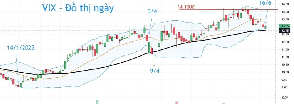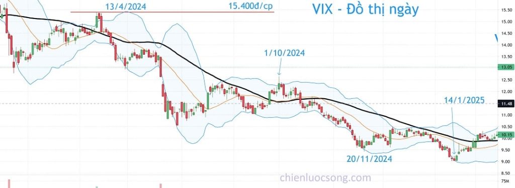 Phía dưới là cổ phiếu VIX. Vùng màu xanh là Bollinger Band (BB). Đường màu đen là MA 50.