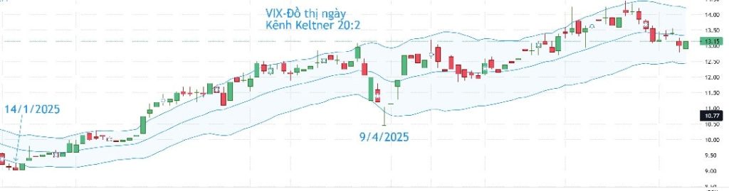 Phía dưới vẫn là cp VIX nhưng dùng kênh Kelner 20:2: Trung bình 20 phiên với bội số là 2