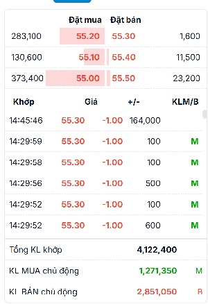 Trong toàn bộ phiên giao dịch đã có 1.271.350 cổ phiếu ở dạng chủ động mua và 2.851.050 cổ phiếu ở dạng chủ động bán. Nó thể hiện rằng phe bán mạnh hơn phe mua (điều này là một phần nguyên nhân khiến giá đóng cửa của ngày thấp hơn giá mở cửa)